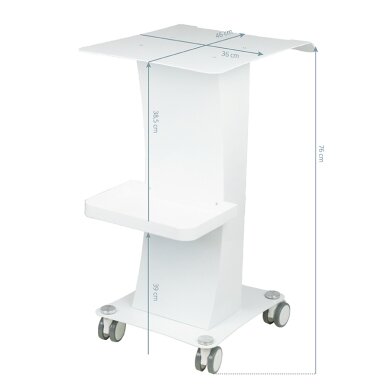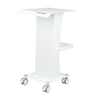 Funktioneller Kosmetikwagen aus Metall mit Gummirädern. Es hat Bremsen. Perfekt zur Aufbewahrung von Hardware. Es verfügt über eine stabile Ablage für das Gerät und eine zweite Ablage für Zubehör. Sorgt für Komfort und Bequemlichkeit beim Arbeiten.
