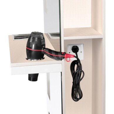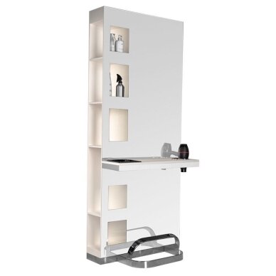 Moodne ja elegantne juuksuripult suure peegli ja mugavate riiulitega mõlemal küljel. Kvaliteetne ja vastupidav viimistlus. Elegantne ja praktiline mööbel, mis rõhutab iga juuksurisalongi interjööri.