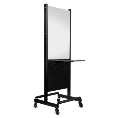 Praktiline kahepoolne ratastel juuksuripeegel. Sellel on kokkupandavad riiulid, nii et see säästab ruumi ideaalselt. Liikuvuse tagavad rattad, millel on lukud. Riiulitel on augud fööni jaoks.