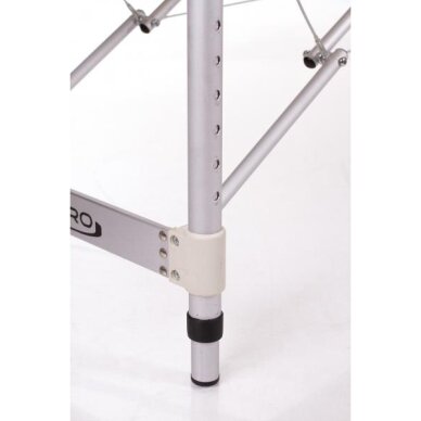 Kokkupandav 2-osaline alumiiniumraami ja reguleeritava kõrgusega jalgadega massaažilaud. Äärmiselt kerge, mistõttu on see ideaalne protseduuride läbiviimiseks kodus ja kontoris. Laud on kaetud kvaliteetse ökonahaga ning voodriks on kasutatud 4 cm paksust polsterdusmaterjali.