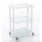 Metallraamiga GIOVANNI kosmeetikakäru, millel on 3 klaasist riiulit ja kosmeetikalambi kinnituspunkt ratastel.