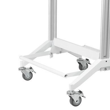 Practical double-sided hairdressing mirror on wheels. It has folding shelves, so it perfectly saves space. Mobility is ensured by wheels that have locks. The shelves have holes for a hair dryer.