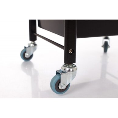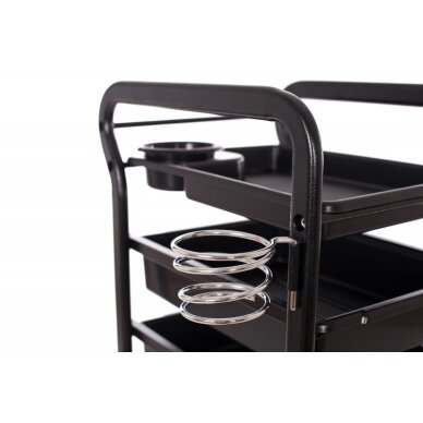 Sturdy, metal hairdressing trolley. Five pull-out drawers allow you to store the many accessories you need. The top is equipped with holders for dryers. Now you can forget about the clutter on your desk - with this trolley you'll always find what you need in no time.
