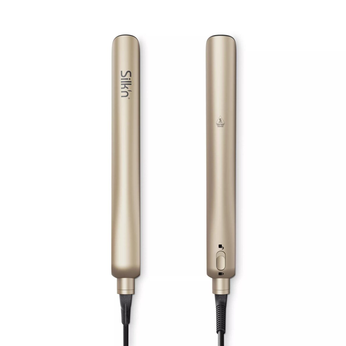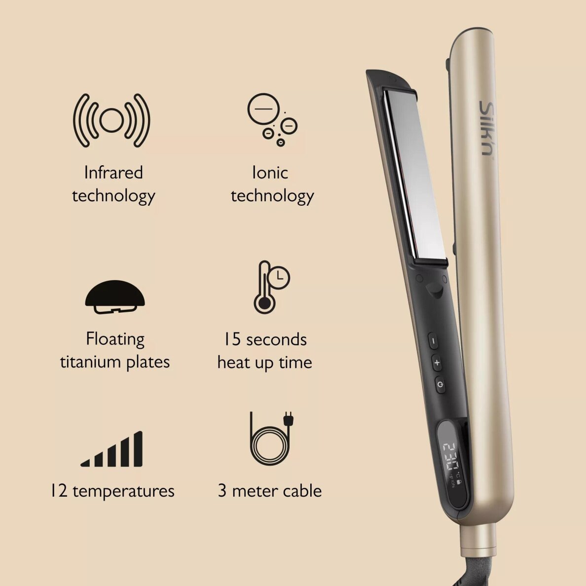 The SilkyStraight hair straightener features a rose gold color, automatic shut-off, sliding titanium plates, 15-second heat-up time, 12 temperature settings, and a 3-meter cord.