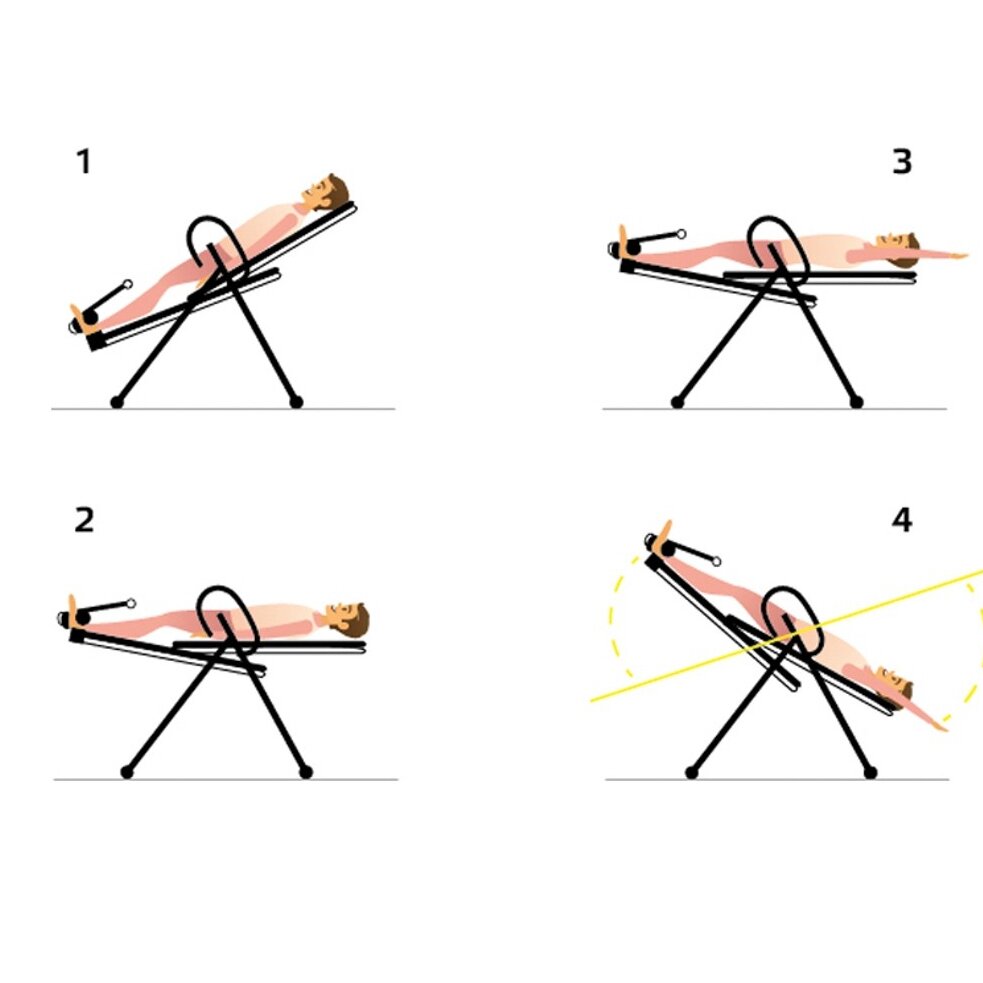 Orthopedists and physiotherapists recommend the "head down" position to relax the spine, thighs, and knee joints. This position is also an excellent preventive measure against muscle strain. Relaxation exercises with the INPORTLINE VERGE trainer are especially recommended after prolonged back strain (e.g. long driving, sedentary work, etc.).