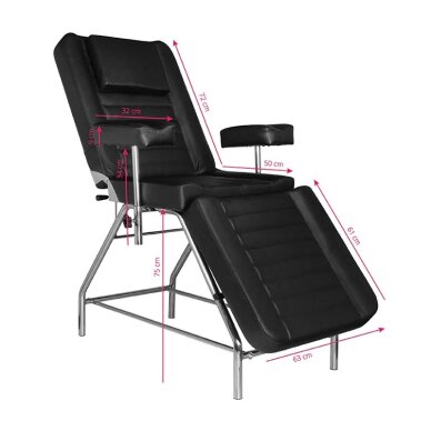 The tattoo chair is upholstered in easy-to-wash eco-leather, with manually adjustable armrests, backrest and footrest.