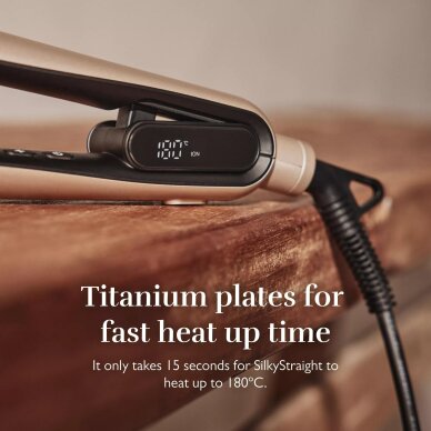 SilkyStraight-hiusten suoristimessa on ruusukultan värinen, automaattinen sammutus, liukuvat titaanilevyt, 15 sekunnin lämmitysaika, 12 lämpötila-asetusta ja 3 metrin johto.