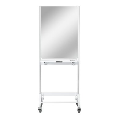 Käytännöllinen kaksipuolinen kampaamopeili pyörillä. Siinä on taitettavat hyllyt, joten se säästää täydellisesti tilaa. Liikkuvuus varmistetaan lukollisilla pyörillä. Hyllyissä on reiät hiustenkuivaajalle.