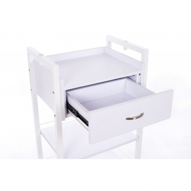 Tässä kosmetologin vaunussa voit säilyttää kätevästi suurimman osan työssäsi tarvitsemistasi tarvikkeista - siinä on laatikko ja kaksi hyllyä. Ja koska vaunussa on pyörät, voit siirtää sen helposti oikeaan paikkaan.