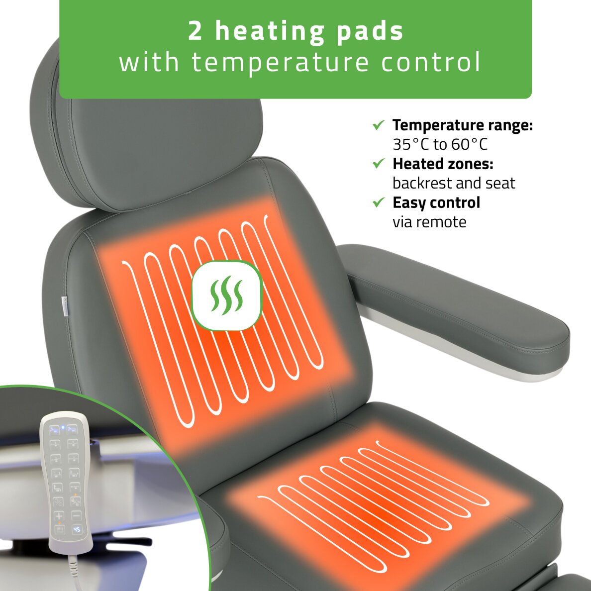 - Lämmitys kaukosäätimellä – mukavuutta koko toimenpiteen ajan: istuimen ja selkänojan lämmitysjärjestelmää ohjataan kaukosäätimellä, jossa on lämpötilanäyttö; säätö 35–60 °C.