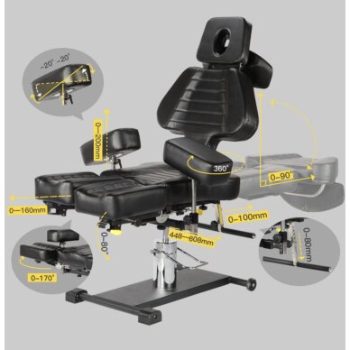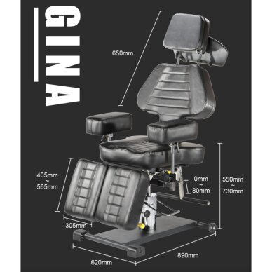 Ammattimainen, monipuolinen ja erittäin kestävä Gina Brighton -tatuointituoli on suunniteltu mukavaan asiakasasentoon erilaisissa toimenpiteissä – kosmetologiasta ja jalkahoidosta tatuointeihin. 10 cm erittäin pehmeää vaahtomuovia, tukeva teräsrunko ja helposti puhdistettava kiiltävä PVC (ekonahka) takaavat mukavuuden ja kestävyyden intensiivisen työskentelyn aikana.