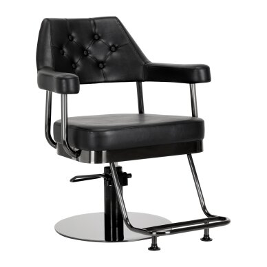 Moderns, elegants un ērts friziera krēsls ar izturīgu hroma pamatni. Melna, augstas kvalitātes eko āda un regulējams sēdekļa augstums nodrošina komfortu un stabilitāti, veicot dažādus griešanas un veidošanas pakalpojumus.