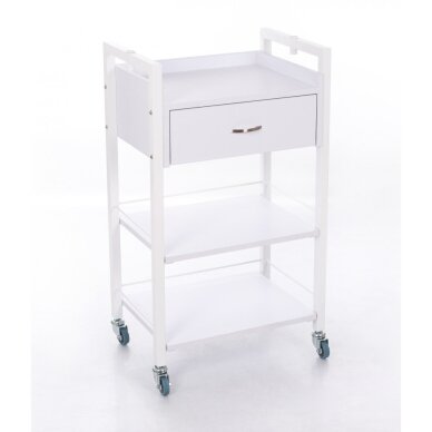 Šajā kosmetoloģijas ratiņos var ērti glabāt lielāko daļu darbam nepieciešamo piederumu - tiem ir atvilktne un divi plaukti. Tā kā ratiņiem ir riteņi, tos var viegli pārvietot uz vajadzīgo vietu.