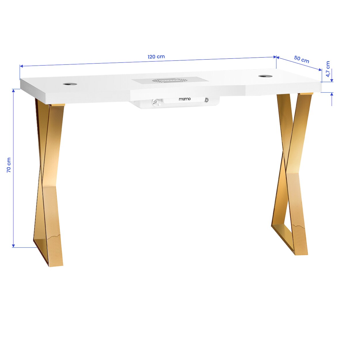 Spīdīgi balta augšdaļa un ģeometriskas, zelta krāsas kājas piešķir tai vieglu un modernu sajūtu . Pateicoties vieglajai formai, rakstāmgalds lieliski iederēsies gan mazās telpās, gan plašos interjeros, uzsverot to atšķirīgo raksturu . Tas ir lielisks ieguldījums ikdienas darba estētikā un komfortā.