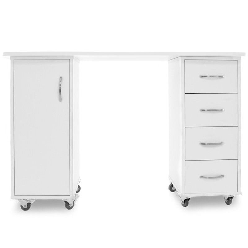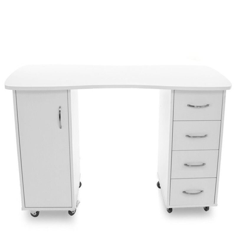 Funkcionāls un izturīgs galds kosmetoloģijas kabinetam. Tam ir viens skapis ar diviem lieliem plauktiem un viens skapis ar četrām atvilktnēm.
