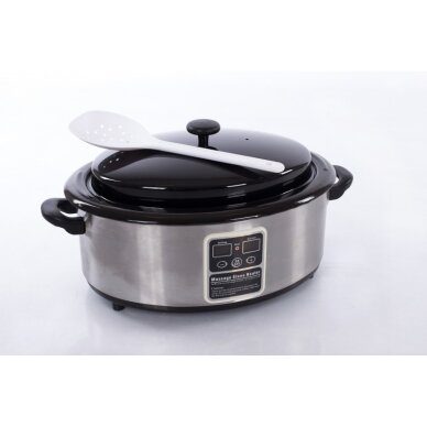 Profesionālas klases sildītājs karsto akmeņu terapijai. Izgatavots no nerūsējošā tērauda, uztur nemainīgu temperatūru, neskarst, ērti rokturi.