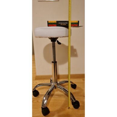 Regulējams augstums 48–61 cm, 360° rotācija, stabila piecstūra pamatne un ritentiņi nodrošina ergonomisku un ērtu darbu dažādu procedūru laikā. Baltais sēdeklis ar sintētiskās ādas apdari pieskaņojas caurspīdīgajai konstrukcijai, piešķirot tai elegantu un modernu izskatu.