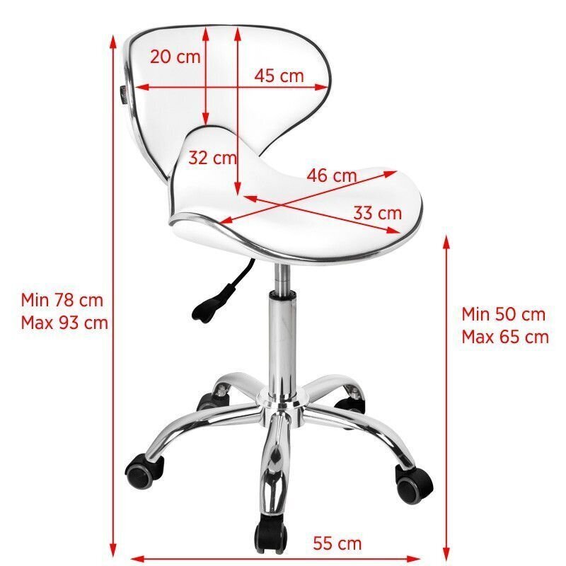 Profesionāls kosmetoloģijas meistara krēsls uz izturīgas piecstūra formas pamatnes ar riteņiem.