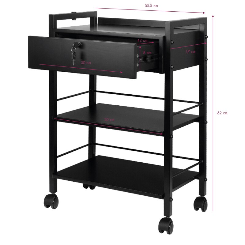 Wózek kosmetyczny TATTOO BLACK. Solidna stalowa konstrukcja zapewnia długą żywotność. W drewnianej szufladzie możesz przechowywać sprzęt i akcesoria. Posiada uchwyt na lampę.