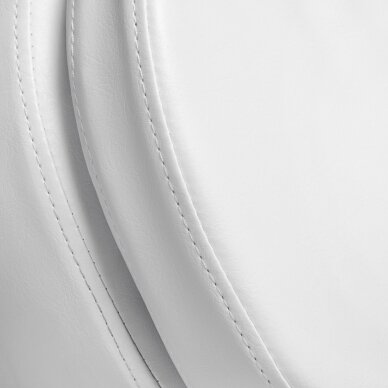 Fotel wypełniony jest wyprofilowaną pianką i pokryty przyjemną w dotyku skórą syntetyczną w odcieniach bieli. Użyty materiał sprawia, że sprzęt jest łatwy w czyszczeniu, a także odporny na wilgoć i wybrane środki dezynfekcji. Solidna podstawa wykonana z trwałego materiału w odcieniach bieli zapewnia stabilność w trakcie zabiegów. Odpowiednio wyprofilowane obszycia nadają fotelowi stylowy wygląd i sprawiają, że siedzisko jest ergonomiczne. Minimalistyczny, prosty design i klasyczna kolorystyka pozwalają mu wpasować się w każde wnętrze.