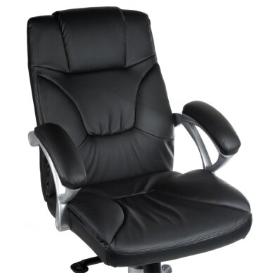 Ergonomiczny fotel biurowy posiada bardzo wygodne siedzisko obite ekoskórą, dzięki czemu idealnie sprawdzi się podczas wielogodzinnej pracy. Wygodny tył krzesła nie obciąża i nie obciąża kręgosłupa. To nowoczesne krzesło biurowe świetnie prezentuje się w każdym pomieszczeniu. Dodatkowym atutem są wytrzymałe gumowe kółka.