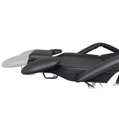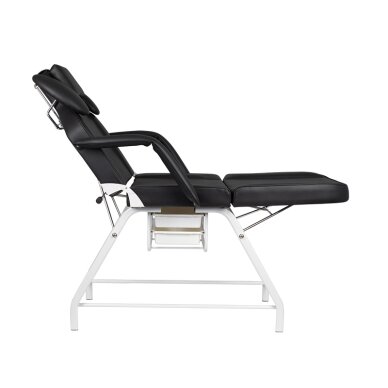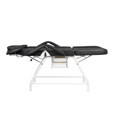 Fotel kosmetyczny posiada ręcznie regulowany podnóżek, oparcie i podłokietnik. Podłokietnik to niezwykle praktyczne rozwiązanie, niespotykane w innych krzesłach. W zestawie znajdują się wygodne tace do przechowywania niezbędnych akcesoriów.