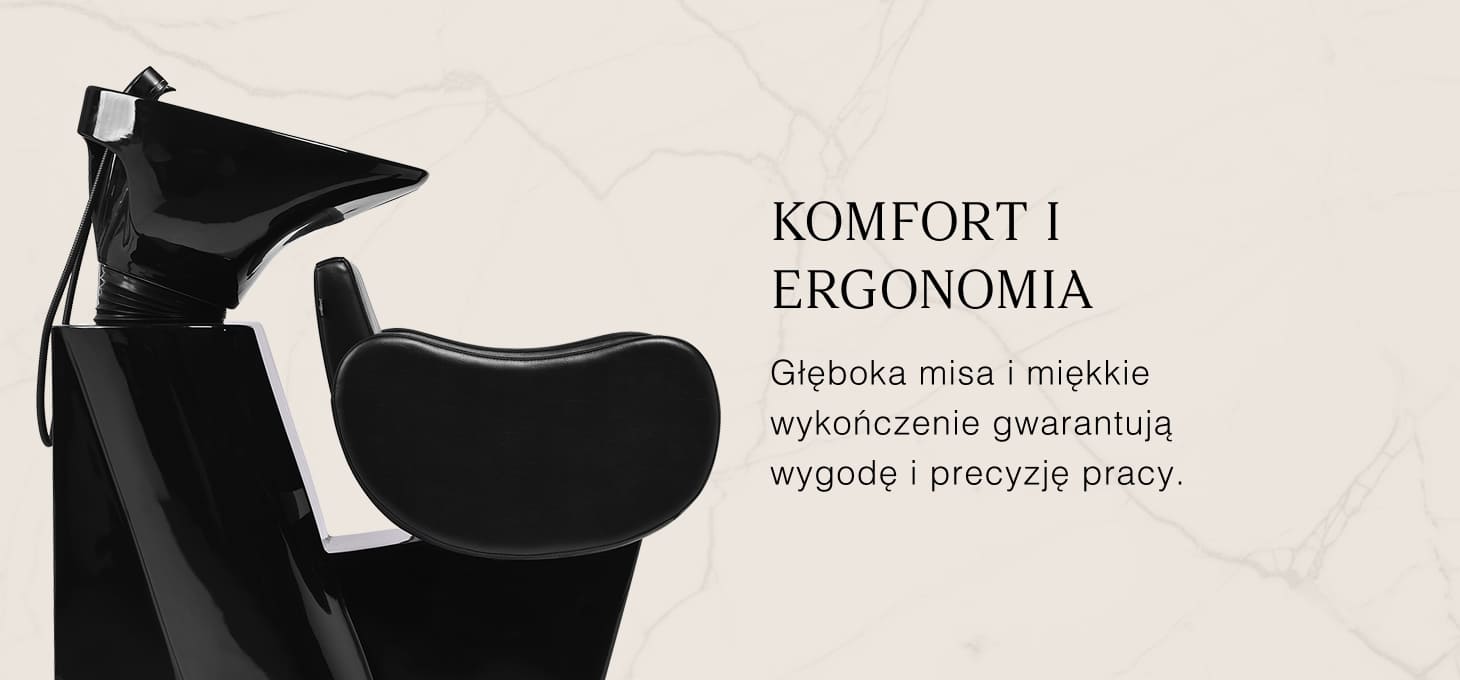 Ceramiczna misa w odcieniach czerni jest głęboka, co ogranicza rozchlapywanie wody i produktów używanych podczas zabiegów. Regulowany kąt nachylenia misy pozwala dopasować ją do indywidualnych potrzeb, a zastosowany materiał sprawia, że umywalka jest wytrzymała, odporna na przebarwienia i zadrapania oraz łatwa do utrzymania w czystości. Ergonomicznie wyprofilowany kołnierz gwarantuje wygodne podparcie głowy, natomiast miękka nakładka z tworzywa sztucznego w odcieniach czerni eliminuje uczucie chłodu ceramicznej powierzchni.