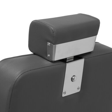 Solidna konstrukcja okrągłej podstawy zapewnia stabilność oraz wysoki komfort użytkowania. Wypełnienie siedziska z odpornej na odkształcenia pianki oraz obicie wykonane z przyjemnej w dotyku skóry syntetycznej o matowym wykończeniu zapewniają trwałość mebla oraz jego komfortowe użytkowanie przez długi czas. Stylowe przeszycia na tapicerce nadają fotelowi charakteru, przywodząc na myśl design motoryzacyjny, co podkreśla jego elegancki wygląd. Sprawiają również, że sprzęt jest odporny na wilgoć, wytrzymały oraz łatwy do czyszczenia. Pokrycie w odcieniach szarości nadaje mu wyjątkowego charakteru, a minimalistyczny styl pozwala mu wpasować się w wystrój każdego salonu barberskiego.