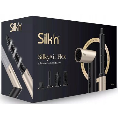 - Akcesoria: SilkyAir Flex ma pięć nasadek zapewniających wszechstronną stylizację: 2 nasadki z funkcją automatycznego nakładania włosia, szczoteczkę zwiększającą objętość, szczoteczkę owalną i koncentrator.