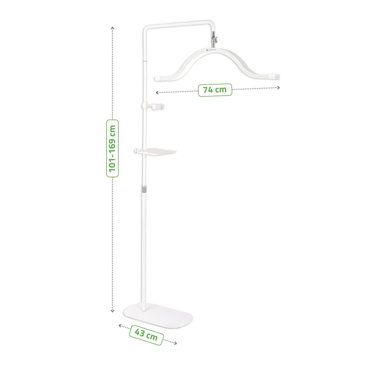 Светильник имеет 3 режима цветности (тёплый, нейтральный, холодный), плавную регулировку яркости и регулировку угла наклона в двух плоскостях. Интуитивно понятная сенсорная панель управления позволяет мгновенно менять настройки, а прочная конструкция с регулировкой высоты от 101 до 169 см обеспечивает полную свободу выбора положения. Дополнительные аксессуары расширяют функциональность.