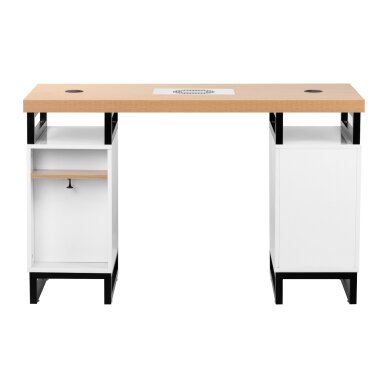 Стол имеет два функциональных шкафа с вместительными ящиками – четыре с левой стороны, два с правой и один побольше, идеально подходящий для крупных аксессуаров или устройств. Такое расположение облегчает поддержание порядка и быстрый доступ к необходимым инструментам. Открытые полки над ящиками прекрасно подойдут в качестве места для устройств или часто используемых аксессуаров. Специальные крепления и отверстия для кабелей позволяют эстетично проложить кабели, что повышает комфорт работы и помогает поддерживать порядок на рабочем месте. Также в конце стола есть небольшая полка для клиентов.