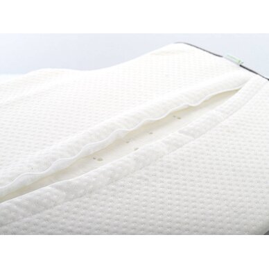 Ортопедическая подушка для шеи и головы имеет прочный антибактериальный чехол из приятного на ощупь, дышащего материала. Боковые стороны изделия укреплены швами из мягких нитей атласного переплетения, которые не мнутся и приятны на ощупь. Чехол застегивается на молнию, поэтому его можно легко снять и постирать в стиральной машине при температуре 30°C. Идеально прилегает к поверхности ортопедической подушки и сохраняет свою первоначальную форму даже после многократных стирок. Материал чехла сертифицирован по стандарту OEKO-TEX 100.