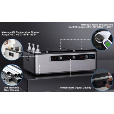Зона нагрева массажного масла оснащена тремя нагревательными трубками мощностью 50 Вт, а зона нагрева массажных камней — двумя нагревательными пластинами мощностью 500 Вт, что позволяет независимо контролировать и регулировать нагрев массажного масла/крема/лосьона и горячих камней. Инновационная конструкция массажного масла и нагревателя горячих камней не только позволяет эффективно контролировать зону, но и помогает экономить электроэнергию.