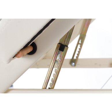 Эта модель выделяется среди других благодаря эстетичному и привлекательному внешнему виду (ножки стола тонированы в цвет красного вина), гармоничному сочетанию используемых материалов и удобству для клиента. Регулировка высоты ножек позволяет адаптировать стол к росту каждого массажиста, что обеспечивает оптимальные результаты во время сеанса массажа. Для еще большего комфорта стол оснащен подголовником (алюминиевое основание), регулируемым по высоте и углу наклона, а также местом для размещения рук, как у головы, так и по бокам. Закругленные углы стола дополнительно покрыты виниловой защитой.