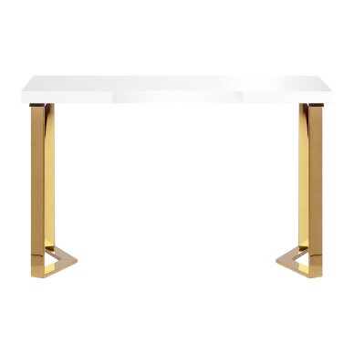 Косметический столик современной формы, сочетающий в себе белую столешницу и золотистые геометрические ножки, привносит в интерьер легкость и элегантность . Благодаря своей компактной, но стильной форме стол прекрасно впишется как в небольшой офис, так и в более просторный современный интерьер.