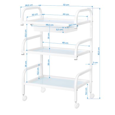 Прочная белая алюминиевая рама и стеклянные полки создают современное и эстетичное целое , которое легко чистить. Четыре ролика обеспечивают мобильность, облегчая организацию рабочего пространства, а прочные материалы гарантируют устойчивость и долгий срок службы.